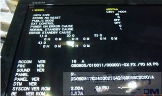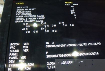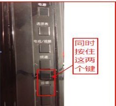 如上图,同时按住音量加和节目减键,插上电源,再按电源键,指示灯变绿色,光栅出现再松手。这时候不再关机,这个时候你不要以为故障排除了,只要一关机再开又会保护。但至少可以确定是软件出了问题。这时我们可以试一下解除保护,首先进入维修模式。方法如下。