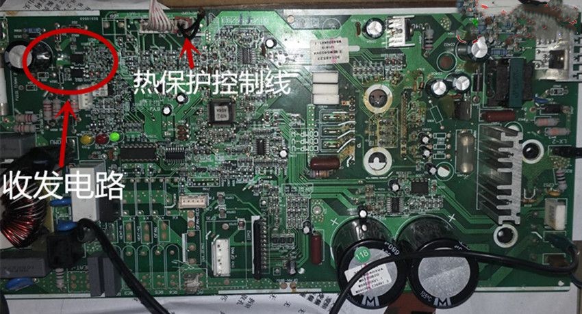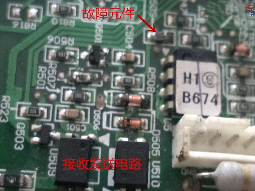 接下来把思路放到外机收发电路上,发送光耦1,2脚1V左右变跳,3脚几十伏变跳,估计问题不大,测接收光耦1,2脚零点几伏变跳,通讯是脉冲电压,用万用表测是否正常不好说,所以在路根据色环,随便检查了外围几个电阻和通讯供电滤波没发现有什么问题。再测接收光耦3,4脚,2.5V无变跳,是光耦问题,因为以前测过正常的机子3,4脚好像是1.2V左右摆动,光耦型号是871,手头只有817,先换上再说,换上后得到的结果仍是E6,是光耦代换问题还是接收后级问题?。后级都是贴片在用户家有点棘手,只得拆板回家研究。