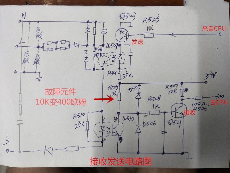 其实故障时,光耦U510的4脚电位也是有变跳的,只是幅度小,在用户家用的是数字表感觉不出来。在家里用的是机械表,因为是脉冲电压,以上数据并非绝对值,只做参考。