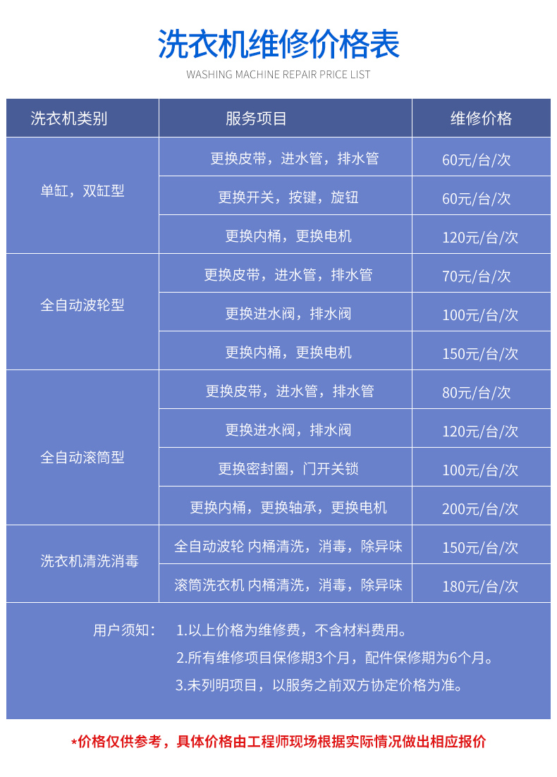 4.维修总费用=上门费 + 维修费 + 配件费,确定维修则免收上门费,预约维修订金并非维修总费用,实际维修费用可能会随着故障大小及更换配件而浮动。