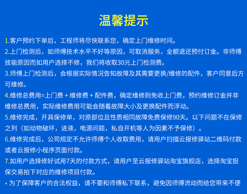 3.师傅上门检测后,会根据实际情况告知故障及其需要更换/维修的配件,客户同意后方可维修。